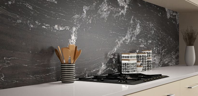 An upstand is a small strip of stone that is installed onto the wall behind the countertop, usually at a height of around 100mm. Upstands are matched to the same colour/stone as the worktop. Splashbacks, as the name suggests, are there to help prevent any splashes of cooking oil hitting the wall. Splashabacks can vary in size, shape, colours and materials. One key difference between the two is their location. Upstands are located along the back edge of the worktop, raised to 100mm whereas splashbacks are usually installed onto the wall behind the hob.