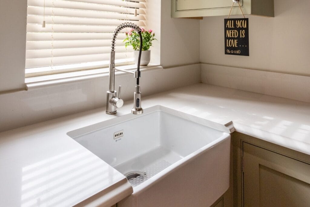 This Valentine’s Day, we’re sharing a love story—between Portman Stone’s craftsmanship and Caesarstone’s “Aterra Blanca” worktops. We installed the beautiful quartz worktops in Dorset, with ogee edges and a matching stone tabletop.