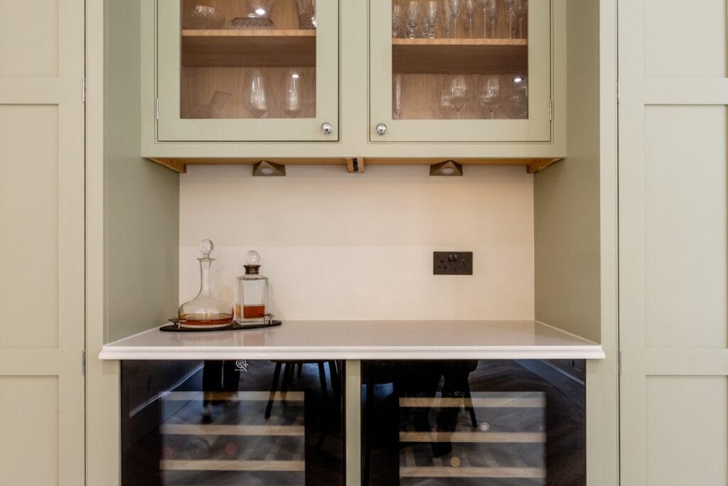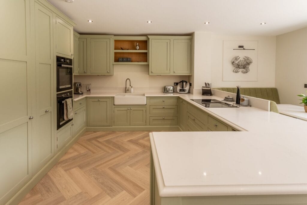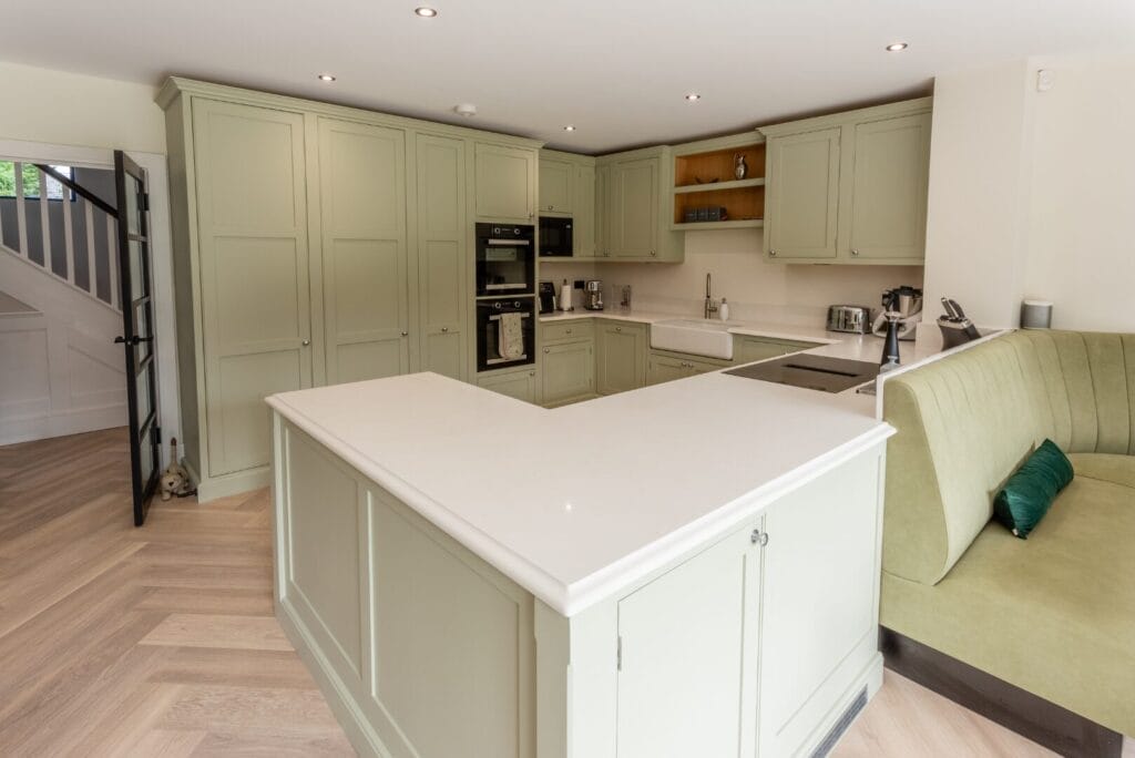 Beyond the worktops, the matching quartz table and bar area create a seamless aesthetic, tying the kitchen together. Choosing the same worktop material for the dining and social spaces ensures harmony in the design, offering a highly durable and easy-to-maintain surface—ideal for busy family life or entertaining guests.