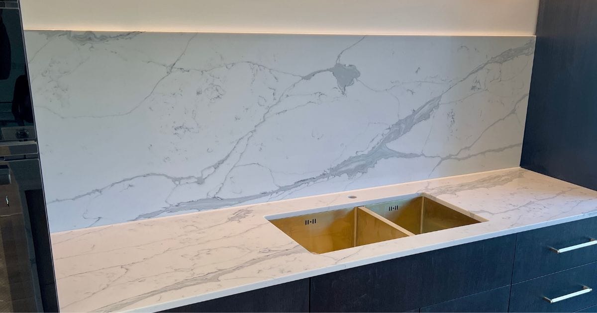 The Unique Calacatta Gold worktops and gold fixtures create a kitchen that`s both elegant and inviting. Get a quote today and we can find the perfect quartz for you!